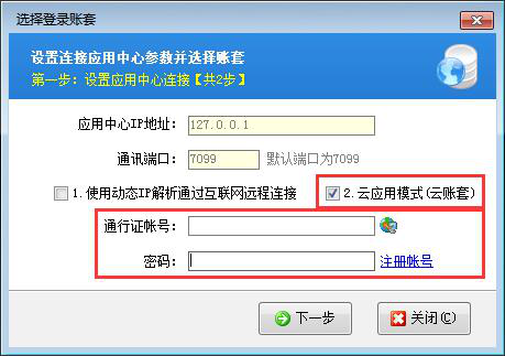 在客戶端程序登錄窗口點擊“選擇賬套”,然后啟用下云應用模式(云賬套),如下圖所示:
