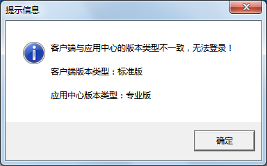 ????(3)如果登錄的時(shí)候提示如下信息,則表明客戶端程序的版本類型與主機(jī)電腦上的應(yīng)用中心程序的版本類型不一致,請(qǐng)使用相同版本類型的程序登錄即可。