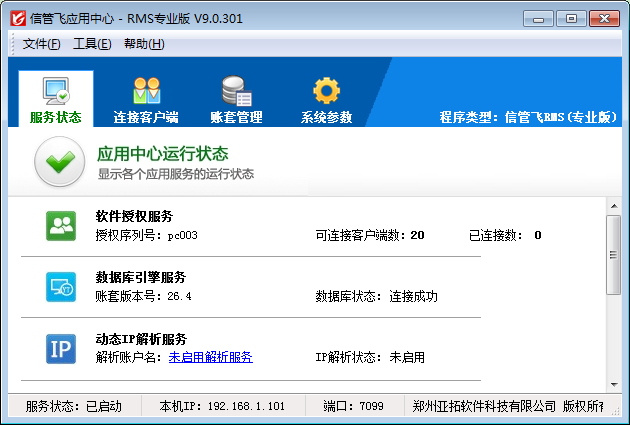 ????應用中心程序是軟件的管理控制中心,集中管理連接客戶端和賬套數據庫,從而實現數據的集中存儲和實時共享。應用中心主要包括運行狀態管理、連接客戶端管理、賬套管理、系統參數配置等功能。
