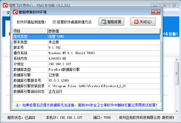 ????數據庫引擎服務顯示數據庫引擎的運行狀態,如果數據庫引擎無法正常連接,客戶端程序無法登錄,請重新安裝數據庫引擎(點菜單“工具”—》“智能修復軟件環境”中點擊“智能修復”按鈕即可重新安裝數據庫引擎)。