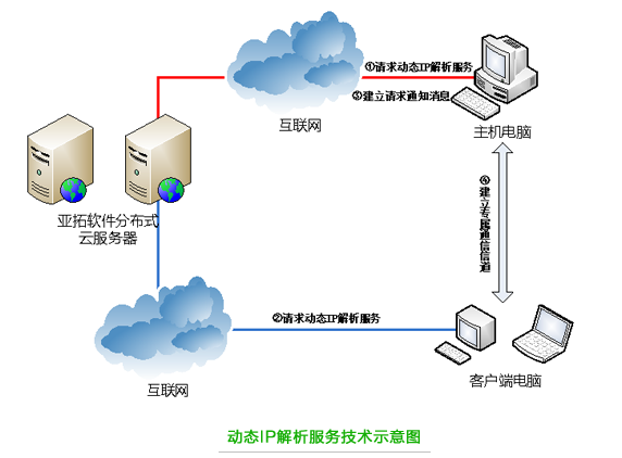 ????動態 IP 解析服務是亞拓軟件自主研發的互聯網遠程連接解決方案,支持通過互聯網使用軟件,為客戶端與應用中心連接提供安全、高效的傳輸通道。啟用動態 IP 解析服務后,客戶端電腦只要能夠連接互聯網,就可以通過解析賬戶名和密碼連接到應用中心使用軟件。動態 IP 解析服務的簡單原理如下圖所示:
