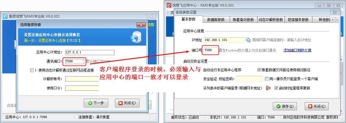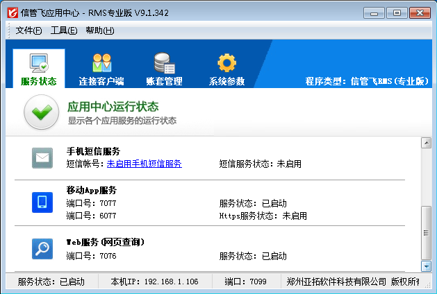 ????應用中心程序只需要在作為主機的電腦上安裝和運行,客戶端程序(即信管飛 RMS 等)連接應用中心,實現數據訪問和存取。因此,使用軟件前必須打開主機電腦,并運行應用中心程序,才可以登錄軟件。