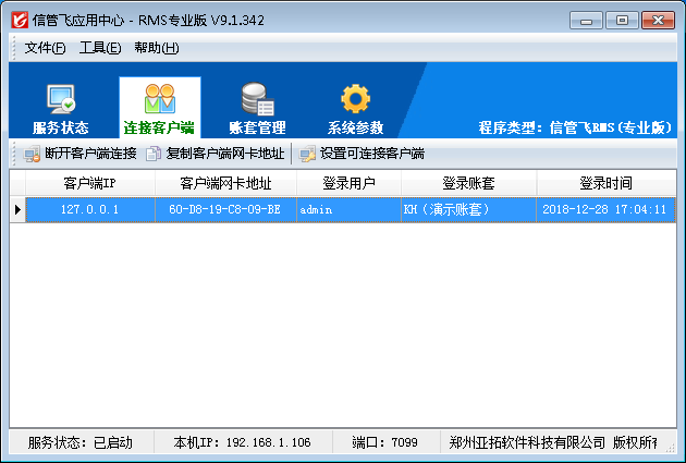 可以管理已連接到主機的客戶端電腦信息,包括客戶端 IP、客戶端網卡地址、登錄操作員、登錄賬套以及登錄時間。