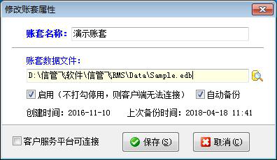 ????(2)修改:修改賬套屬性時,如果有客戶端已登錄這個賬套,則需要先退出客戶端程序,然后再進行賬套屬性的修改。修改賬套屬性時,可以不啟用賬套(即停用),停用后的賬套客戶端程序無法連接;設置是否自動備份賬套,如果設置自動備份,并且系統參數設置中也啟用了賬套備份,則軟件會按照賬套備份參數中的時間間隔定期備份此賬套。