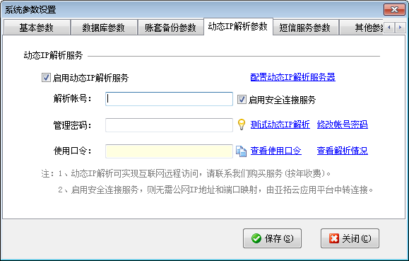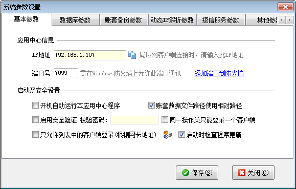 ????系統參數設置主要包括基本參數、數據庫參數、賬套備份參數、動態 IP 解析參數、短信服務參數、其他參數等。