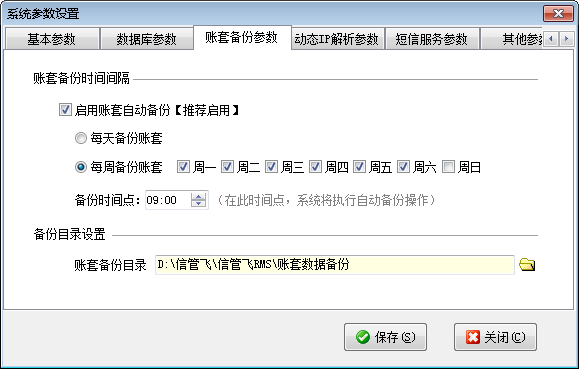 ????賬套備份參數可設置是否啟用自動備份、備份時間間隔和備份目錄。我們強烈建議啟用自動備份,以便賬套出現問題的時候從賬套備份文件中恢復數據。