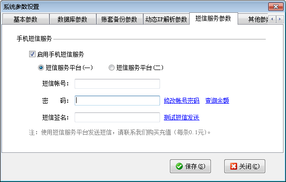 ????手機短信服務為增值服務,購買后可以發送業務通知短信、登錄驗證碼短信等,短信帳號和密碼可以在系統參數中配置。短信服務按條收費,如需使用可聯系客服充值購買。