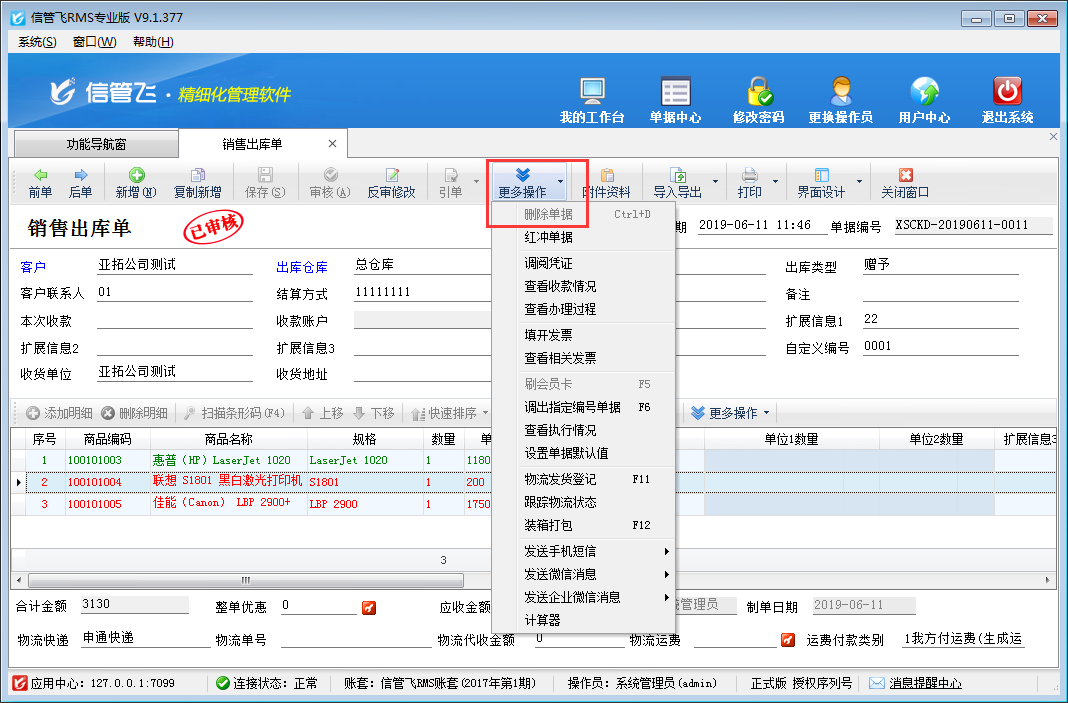 業(yè)務(wù)單據(jù)已審核后默認(rèn)是不允許刪除的,如果需要刪除,需要先紅沖此單據(jù),然后在刪除,即可刪除成功,在單據(jù)界面工具欄點(diǎn)擊“更多操作”—》“紅沖單據(jù)”即可紅沖單據(jù),如下圖所示。