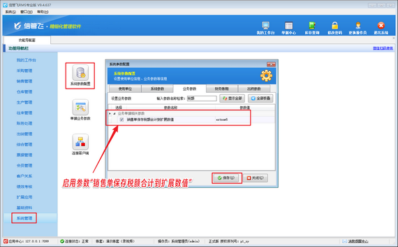 在軟件的功能導(dǎo)航窗中,用戶(hù)只需簡(jiǎn)單幾步操作,即可啟用并配置“銷(xiāo)售單保存稅額合計(jì)到擴(kuò)展數(shù)值”參數(shù)。系統(tǒng)默認(rèn)將該稅額合計(jì)值保存到“extnum5(單據(jù)主體.擴(kuò)展數(shù)值5)”中,但用戶(hù)也可以根據(jù)自身需求進(jìn)行靈活設(shè)置。