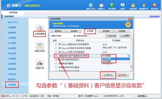 在功能導航欄點擊“系統管理”—“系統參數配置”,點擊“業務參數”,在“特殊功能參數”中勾選“(基礎資料)客戶信息顯示應收款”參數,參數值可選擇“手動刷新”或“自動刷新”模式,保存后立即生效。自動刷新模式可實時同步數據,手動模式則需手動查詢更新,適配不同業務場景需求。