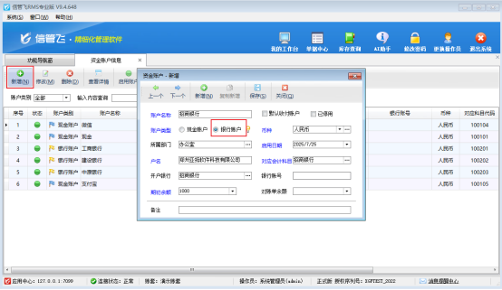 許多用戶在使用軟件記賬時(shí)都會(huì)問(wèn)到一個(gè)問(wèn)題:如何新增現(xiàn)金賬戶和銀行賬戶?本節(jié)我們以信管飛RMS專業(yè)版來(lái)介紹一下進(jìn)銷(xiāo)存軟件內(nèi)如何新增資金賬戶? 在功能導(dǎo)航窗點(diǎn)擊“基礎(chǔ)資料”—“資金賬戶”打開(kāi)資金賬戶信息界面,點(diǎn)擊工具欄中的“新增”按鈕,在彈出的“資金賬戶—新增”窗口錄入賬戶名稱、勾選賬戶類型“現(xiàn)金賬戶”、